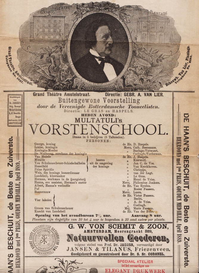 12. MULTATULI Buitengewone Voorstelling door de Vereenigde Rotterdamsche Tooneelisten. Directie: Le Gras en Haspels. Heden avond: Multatuli’s Vorstenschool. Drama in 5 bedrijven (6 Tafereelen).[Toneelprogramma]. Amsterdam, Grand Theatre / Schouwburg Van Lier, [1890]. 32 x 21 cm. Tweezijdig bedrukt. Met versierd portret van Abraham van Lier en geïllustreerde advertenties, waarvan er één in rood gedrukt is. Tweemaal gevouwen. Wat roest en vouwsleet.
