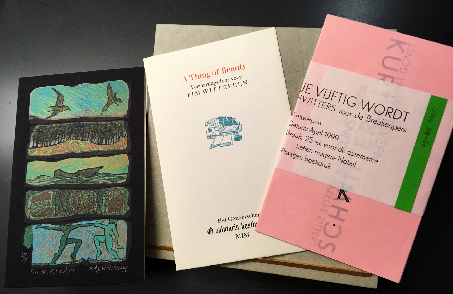 * 26 vrienden, waarvan 22 verschillende drukkers, maakten in totaal 22 bijzondere uitgaven ter gelegenheid van de vijftigste verjaardag van Pim Witteveen (De Breukenpers). In veel gevallen schreef men zelf een tekst, vaak in buitelende typografie vormgegeven of anderszins origineel qua verschijning (Pers No. 14 drukte een merkwaardig ruikend boekje op verschillende soorten kunststof), soms maakte men gebruik van teksten van auteurs (Willem Brakman, Gustave Flaubert, Alfred Kossmann, J.H. Leopold, Bruce Nauman, Kurt Schwitters, Joost Veerkamp, Hendrik de Vries). Jan Keijser (Avalon Pers) drukte een door Ronald Breugelmans samengestelde bibliografie van Pim Witteveens Breukenpers (met gloeiend moeilijk zetwerk), Ger Kleis maakte een uitgave van het door Pam G. Rueter in hout gegraveerde ‘Sub Signo Libelli Alfabet’. Deze met veel hartstocht en drukkersliefde samengestelde, inventieve vriendendoos bevat ook het hoogst vermakelijke boekje Papieren Magneten over de cijferpostzegels van Chris Lebeau (‘O, aandoenlijke aanduiding van een halve cent!’), Jan van Krimpen (juichend: ‘papieren magneten’) en Wim Crouwel (‘laaghangende mist’) van Joost Veerkamp, gedrukt door Jaap Schipper.