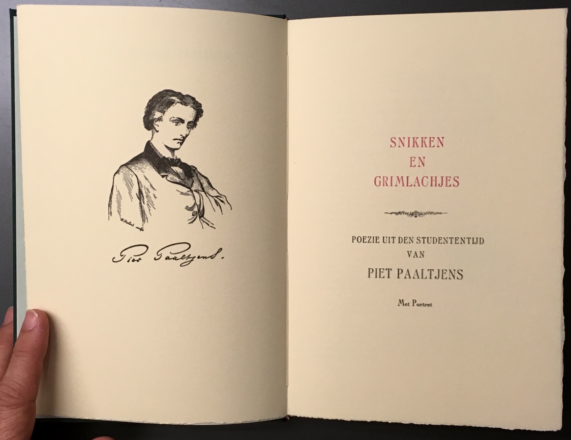 5. PAALTJENS, Piet Snikken en grimlachjes. Poëzie uit den studententijd van Piet Paaltjens. (Margedrukkersproject). (Leiden, Drukkers in de Marge, 1994). Linnen met leeslint (Herman van der Kruijk). Gedrukt door 16 verschillende margedrukkers in een oplage van 90 exemplaren. Rug licht gevlekt.