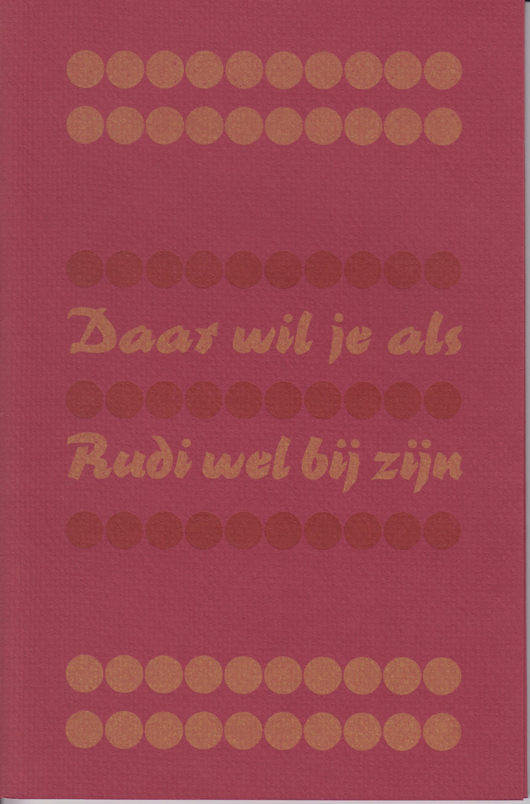 22. (KOPLAND, Rutger). BERNLEF, ENQUIST, KORTEWEG, NOLENS, VAN TOORN, VAN HEE, DE VOS e.a. Daar wil je als Rudi wel bij zijn. Gedichten voor Rudi van den Hoofdakker/ Rutger Kopland bij zijn zeventigste verjaardag. Zoeterwoude-Dorp, De Uitvreter, 2004. 14 vouwbladen/ plano’s in mapje. Met de hand gezet uit diverse corpsen en gedrukt op verschillende soorten papier in een oplage van 100 exemplaren. 1e druk.