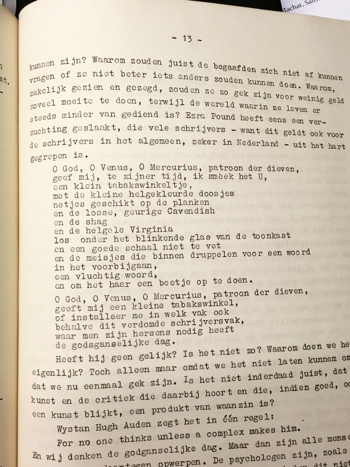 * Verzameling van zes referaten. De verzuchting in de afbeelding betreft een vertaald gedicht van Ezra Pound.