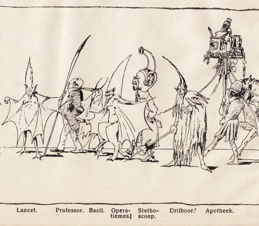* Voor het 285-jarig bestaat van de Utrechtse universiteit in 1921 zou de kunstenaar Huib Luns de optocht bedenken, en samen met de schilders Jan Sluyters, Willy Sluiter en Herman Moerkerk de decorstukken en kleding ontwerpen. Dit is een schets in klein formaat van de lange stoet, getekend door de hoofdbedenker, Huib Luns. Allerlei faculteiten en beroepen maken deel uit van de optocht: filosofen, dokters, maar ook een bacil, een Trofee der Overtredens, de Rheumatiek en de Slapeloosheid, de Electriciteit, de Uebermensch, de Kleine Johannes, de Bond van Inbrekers en de Relativiteitstheorie (met Futurisme en Dadaïsme). Helemaal achteraan rijdt een kar met Moderne Schilders – voortgetrokken door Amor te paard en Silenus met fles te ezel. En in die moderne schilders zijn Sluyters te herkennen, Luns op de kolenkachel en Sluiter met zijn eeuwige peukje. Leuk!