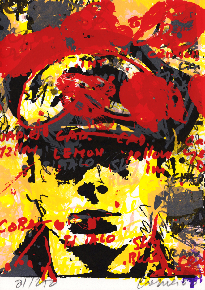 5. CREMER, Jan Ik Jan Cremer. (Speciale Jubileumeditie). Amsterdam, De Bezige Bij, 2000. Jubileumeditie: boek, cd en originele, gesigneerde zeefdruk in kleuren in grote linnen overslagdoos. 44,5 x 32,1 x 6,1 cm. Uitgegeven in een oplage van 250 exemplaren.