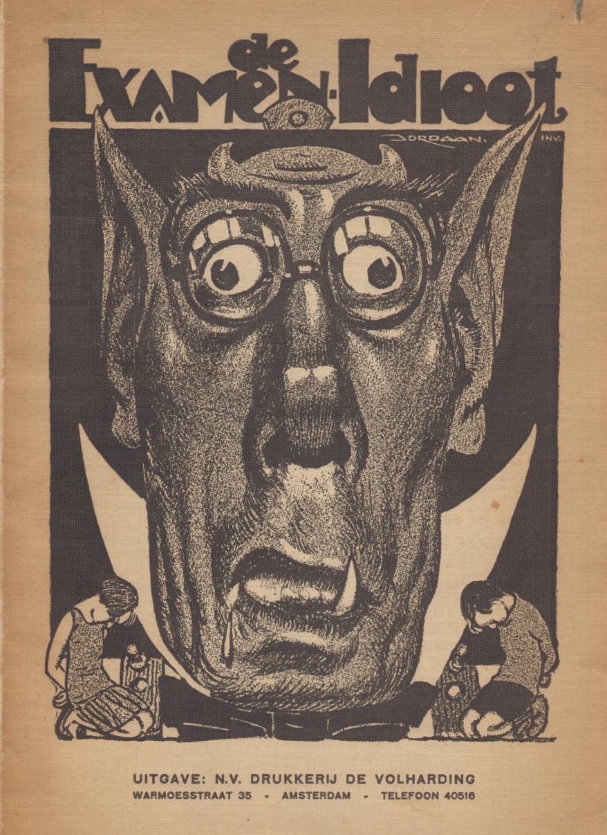 35. [THIJSSEN, Theo] De examen-idioot of de kinderexamens van 1928. Amsterdam, De Volharding, 1928. Ingenaaid (omslagtekening L.J. Jordaan). 44 p. 1e druk. Wat verfomfaaid, deukje in voorkant.