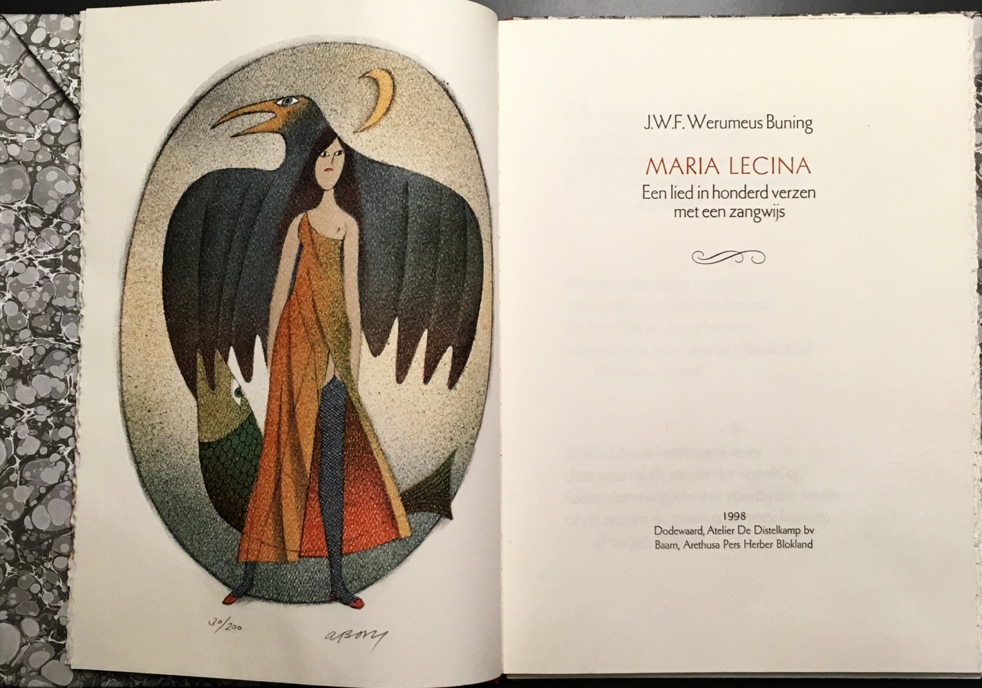 2. (BORN, Adolf). WERUMEUS BUNING, J.W.F. Maria Lecina. Een lied in honderd verzen met een zangwijs. (Met twee originele genummerde en gesigneerde litho’s door Adolf Born) Dodewaard/ Baarn, Atelier De Distelkamp/ Arethusa Pers Herber Blokland, (1998). Linnen met een omslag van marmerpapier (Atelier De Distelkamp/ Geert van Daal). 32,5 x 23,5 cm. Gedrukt in een oplage van 76 genummerde exemplaren. Ongenummerd exemplaar.