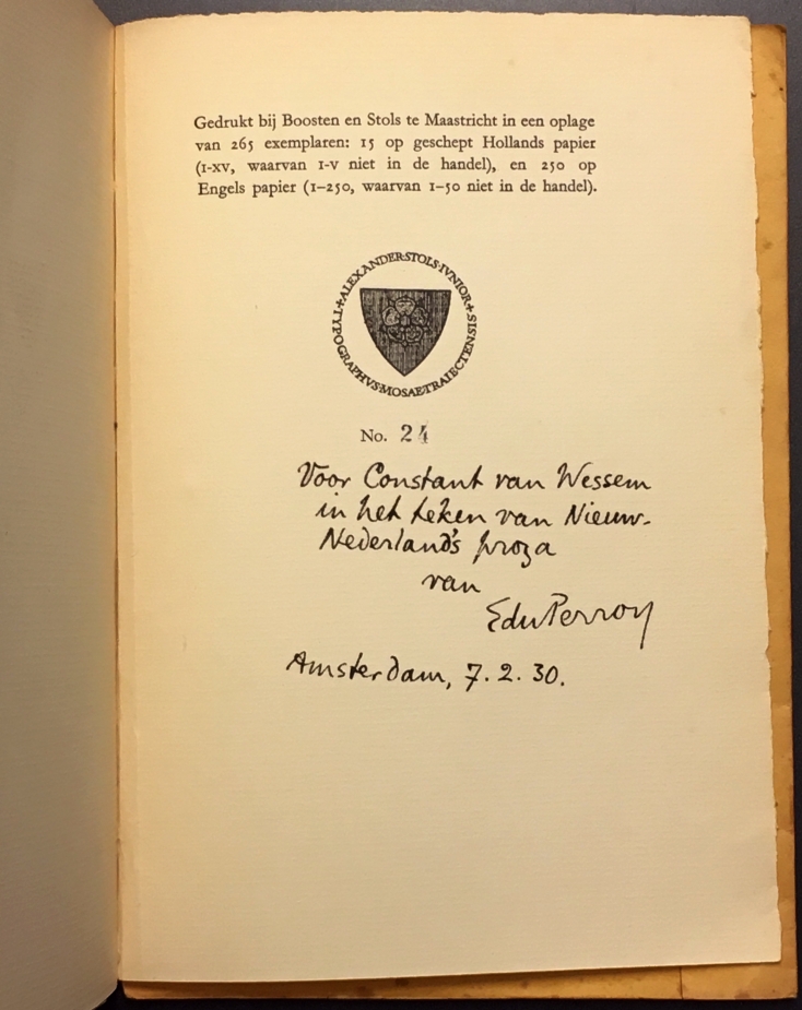 * Opdracht van de auteur in blauwe inkt op de colofonpagina: ‘Voor Constant van Wessem/ in het teken van Nieuw-/ Nederland’s proza/ van/ EduPerron/ Amsterdam, 7.2.30′. De auteur Constant van Wessem (1891-1954), nu vergeten, was een van de vernieuwers van het proza van de jaren twintig en dertig, waarbij hij gebruikmaakte van de dynamiek van de film. Van Wessem schreef zelf in de inhoud van Nutteloos verzet, op p. 141, bij de titel van het verhaal ‘Het drama van Huize-aan-Zee’ met potlood: ‘over de zelfmoord van E.d.P’s vader’.