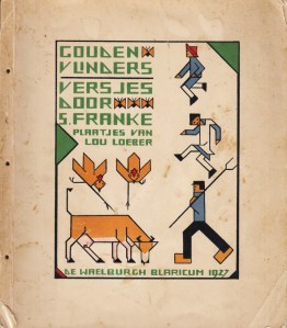 26. (LOEBER, Lou). FRANKE, S. Gouden vlinders. Versjes. Plaatjes van Lou Loeber. Blaricum, De Waelburgh, 1927. 22 x 19 cm. Chinese blokboekbindwijze. (42) p. Met kleurenillustraties van Lou Loeber. 1e druk. Omslag wat gevlekt, hoekjes deels afgesleten, raffia ontbreekt, ezelsoortjes. Op de binnenzijde van het omslag en op p. 7 vage sporen van potloodtekeningen.