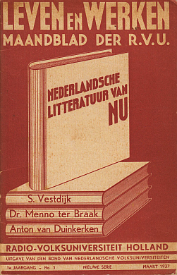 39. VESTDIJK, S. De na-oorlogse poëzie in Nederland. Pag. 1-10 in: Leven en werken. Maandblad der R.V.U. Jg. 1 nr. 3. Rotterdam, Bond van Nederlandsche Volksuniversiteiten, [1935]. Geniet. 32 p. Met foto’s. 1e druk. Wat kreukjes en vlekjes.