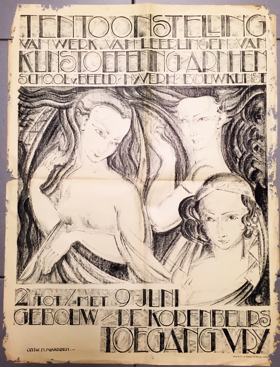 16. KLAASSEN, Nel Tentoonstelling van werk van leerlingen van Kunstoefening Arnhem, School v. Beeld. Nyverh. Bouwkunst. 2 tot / met 9 Juni, Gebouw / De Korenbeurs, Toegang vry. (Lithografisch affiche). Arnhem, [Steendrukkerij] v/h Kluppell & Ebeling, [1926]. Poster, eenzijdig bedrukt. 67,0 x 51,0 cm. Originele lithografie in zwart en grijstinten gedrukt. Linksonder in de steen gesigneerd. Tweemaal gevouwen. Alle marges helaas beknabbeld, maar de afbeelding is vrijwel onaangetast.