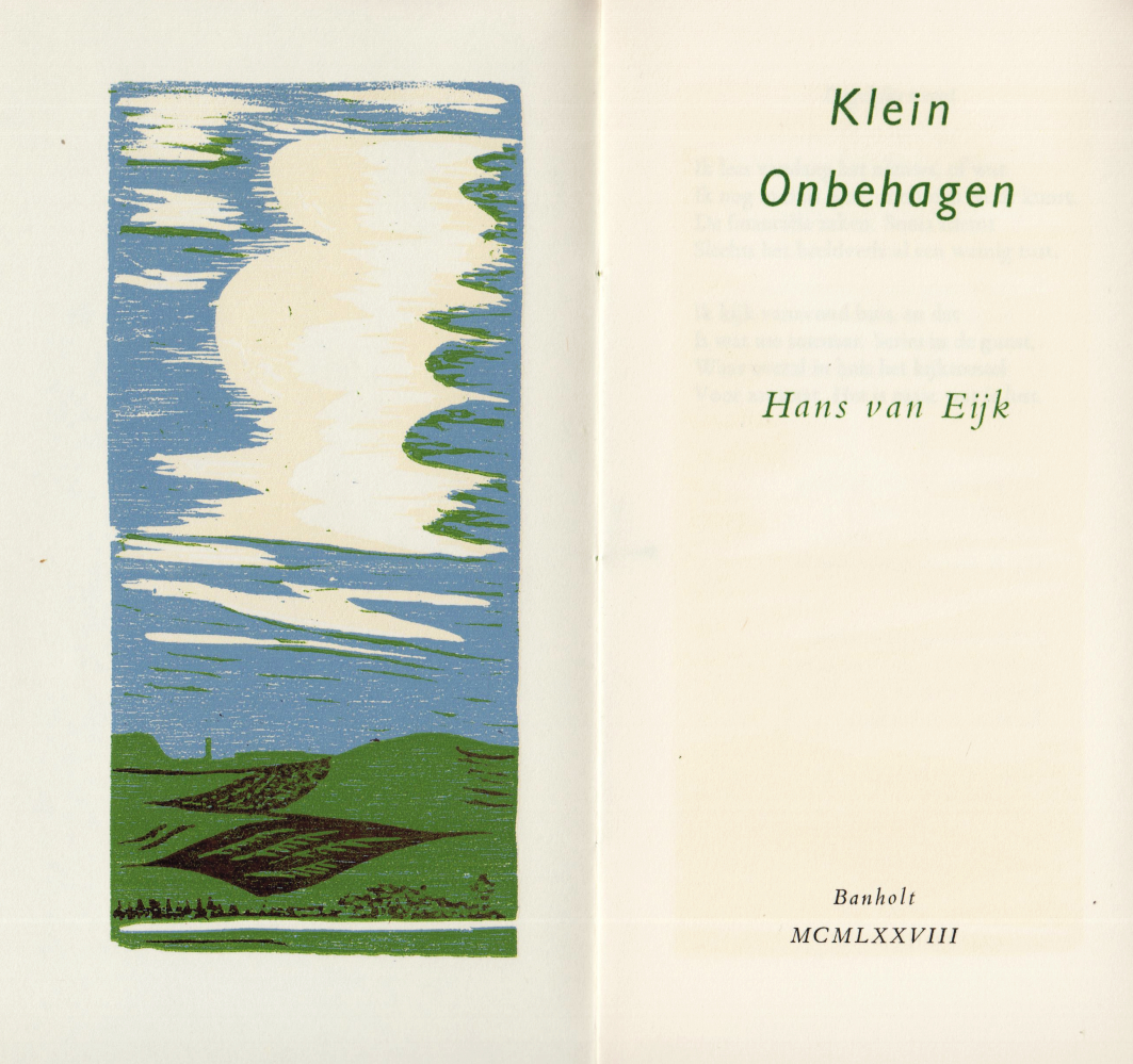 8. EIJK, Hans van Klein onbehagen. (Met twee houtsneden van de auteur). Banholt, (In de Bonnefant), 1978. Cahiersteek. (8) p. Met de hand gezet en gedrukt in groen en zwart in een oplage van 75 op de pers genummerde exemplaren. 1e druk.