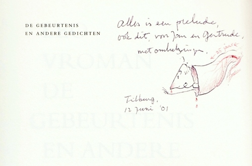 42. VROMAN, Leo De gebeurtenis en andere gedichten. (Gesigneerd met handgeschreven opdracht en tekening van Vroman voor Jan en Gertrude Starink). Amsterdam, Querido, 2001. Ingenaaid. 176 p. 1e druk.