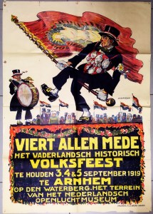 18. LEEUW, Louis de Viert allen mede het Vaderlandsch Historisch Volksfeest te houden 3, 4 & 5 September 1919 te Arnhem. (Grote affiche). Kleurenlithografie gedrukt door Drukkerij A. van der Weerd. 110 x 77 cm. Aan de randen wat scheurtjes en kreukjes. Handgeschreven mededelingen op achterkant: ‘Den Heer Brands Buys/ Arnhem/ Ter Herinnering aan het Volksfeest’. Gevouwen.