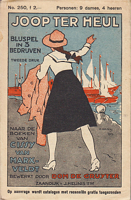5. (DEPARTEMENT VAN VOLKSVOORLICHTING EN KUNSTEN). MARXVELDT, Cissy van Joop ter Heul. Blijspel in drie bedrijven naar de boeken van Cissy van Marxveldt, bewerkt door Dom de Gruyter. Zaandijk, J. Heijnis Tsz., [1934]. Ingenaaid met flappen. Mooie omslagillustratie van Is. van Mens. 160 p. 2e druk. Zeer gaaf.