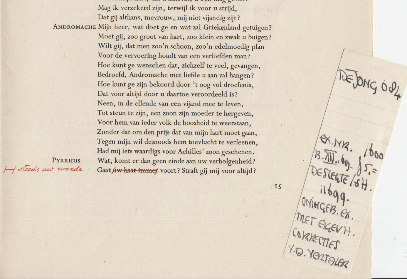 32. (PRINS, Jan) Andromache. Treurspel in vijf bedrijven van Jean Racine. Vertaling van Jan Prins. (Correctie-exemplaar). Antwerpen-Bilthoven, Ad. Donker, 1941 (=1944). Losse katernen, niet genaaid of gebonden. 60 p. Gedrukt in rood en zwart. Wat ezelsoortjes en andere gebruikssporen.