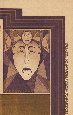* Fantastisch expressionistisch serieontwerp van Pieter A.H. Hofman, dat gedurende enkele jaren met kleine variaties door het Vereenigd Tooneel gebruikt werd. Ook het Wijdeveld-achtige binnenwerk is van Hofman, met zijn monogram getekend. Mooie advertenties voor piano’s, fonografen en radio’s.