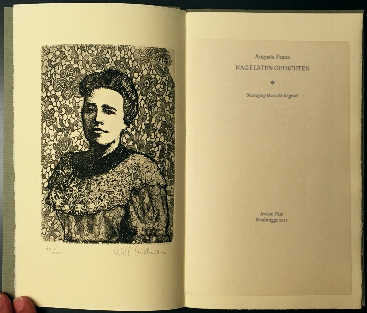 35. PEAUX, Augusta Nagelaten gedichten. Bezorging (en nawoord van) Mario Molegraaf. (Met een genummerde en gesigneerde ets van Will Landman). Woubrugge, Avalon Pers, 2011. Halfleer (Herman van der Kruijk). (28) p. Niet afgesneden. Gezet uit de Meidoorn en de Romanée en gedrukt op Zerkall-Bütten in een oplage van 75 genummerde exemplaren. 1e druk.