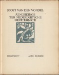 42. VONDEL, Joost van den Aenleidinge ter Nederduitsche dichtkunste. Maastricht, [A.A.M. Stols], (januari) 1922. Ingenaaid met flappen. (8), 20 p. Vignet in grijsblauw, gesneden door Henri Jonas. Gezet uit de Hollandsche Mediaeval en gedrukt in rood en zwart in 90 exemplaren op Haesbeek. 1e druk. Mooi exemplaar.