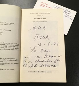 * Met op p. 3 een opdracht van Marguerite Duras (1914-1996) aan de actrice Elisabeth Andersen: ’12-6.86/ La Haye/ avec ma tendresse et/ mon admiration pour/ Elisabeth Andersen’. Daarboven tweemaal haar handtekening. En op p. 5 een opdracht ‘Pour Elisabeth/ souvenir/ de/ Madeleine/ Renaud’ van de Franse actrice Madeleine Renaud (1900-1994), de favoriete actrice van Duras, die in 1982 de hoofdrol had in de eerste Franse vertoning. Voorin schreef Andersen haar initialen ‘E.A.’ en in het boekje ligt een visitekaartje van Odile Chenal van de Franse ambassade, waarop Chenal (?) het huisadres van Duras heeft geschreven.