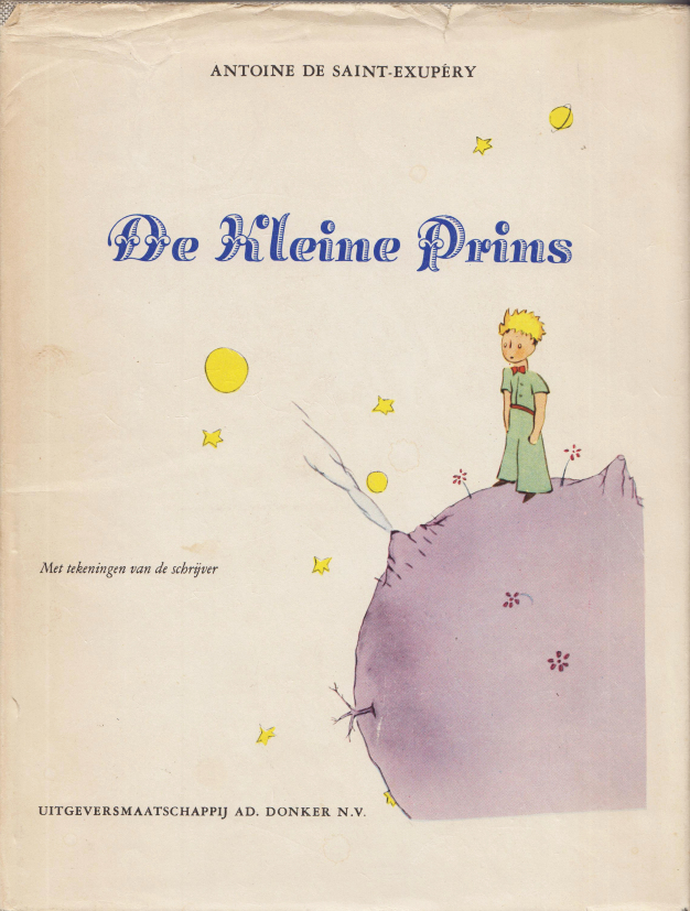 38. SAINT-EXUPÉRY, Antoine de De kleine prins. Met tekeningen van de schrijver. Rotterdam, Ad. Donker, 1951. Linnen met stofomslag. 80 p. Illustraties in kleuren. 1e druk. Omslag mist wat hapjes en heeft kreukjes aan boven- en onderkant in de buurt van de rug.