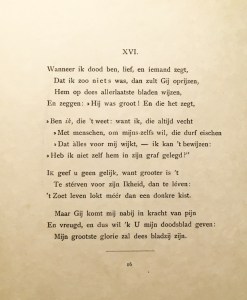 ‘…laat, genaadge dood, me één gunst verhopen:/ dat ge me niet geluidloos nageslopen,/ gelijk een vijand die zijn woord verraadt,/ heel onverhoeds en ruggelings nederslaat.’