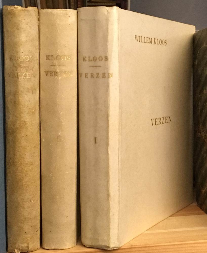 * Dé bundel van Willem Kloos, bovendien één van de waarschijnlijk slechts enkele (10?) luxe-exemplaren op zwaar, glanzend keizerlijk Japans papier! Alle exemplaren werden gebonden in perkament, maar in afwijking van de gewone eerste drukken is dit exemplaar gebonden in bijzonder fijn kalfsperkament, en met een I in goud op de rug – vandaar wellicht wat later gebonden dan de gewone exemplaren. Een bijzonder fraaie, hoogst zeldzame luxe uitgave!