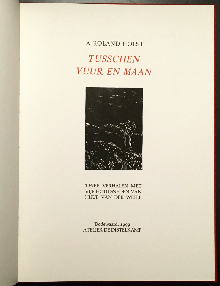 34. ROLAND HOLST, A. Tusschen vuur en maan. Twee verhalen met vijf houtsneden van Huub van der Weele. Dodewaard, Atelier De Distelkamp, 1999. 26 x 19 cm. Rood linnen. 60 p. Gezet uit de Palatino en gedrukt in 55 genummerde exemplaren. 4e druk. Met begeleidend briefje van de uitgever. Zeer gaaf.