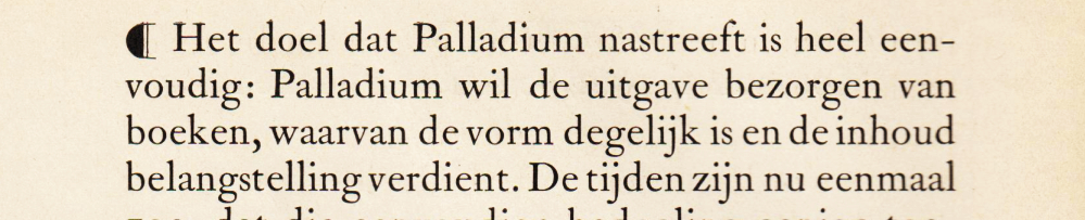 Deze maand is het 100 jaar geleden dat de Palladiumreeks gelanceerd werd. In Palladium toonde Jan van Krimpen zich de zuivere, dienende maar eigenzinnige typograaf die hij zijn leven lang zou blijven. Het idee: goede teksten laten zien op eenvoudige wijze, zonder opsmuk maar met gebruikmaking van alle subtiliteiten van het boek – die geniale middeleeuwse machine. Letters, kleur, papier zacht of juist ruig…