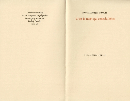 1. BÜCH, Boudewijn C’est la mort qui console, hélas. [Amsterdam], Sub Signo Libelli, (1983). Vouwblad. Met de hand gezet en gedrukt door Ger Kleis in oranje en zwart in een oplage van 100 exemplaren.