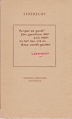9. HERINGA, P.M. (Als:) LEBERECHT A phoenix too infrequent. (Met een originele, genummerde en gesigneerde drogenaaldets door Hans Abbing). Amsterdam, Phoenix Editions, (1984). Cahiersteek met rood garen. (6) p. Met de hand gezet uit de Spectrum en gedrukt in rood en zwart op Barcham Green in een oplage van 60 genummerde exemplaren. In het kader op het omslag enkele door de auteur handgeschreven regels, in rood gesigneerd ‘Leberecht’. 1e druk.