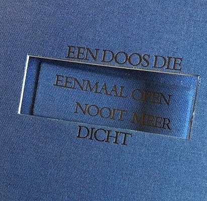 35. DRUKWERK IN DE MARGE, STICHTING Een doos die eenmaal open nooit meer dicht. Samenstelling: Wiel Kusters. (Blauwe Scheen-doos met 53, meest gesigneerde boekjes). (Banholt/ Woubrugge), De Blauwe Scheen, 1984 [= 1985]. 55 (vouw)bladen in blauwlinnen overslagdoos met kijkgaatje (Binderij Phoenix). Vervaardigd in een oplage van 90 op de pers genummerde exemplaren.