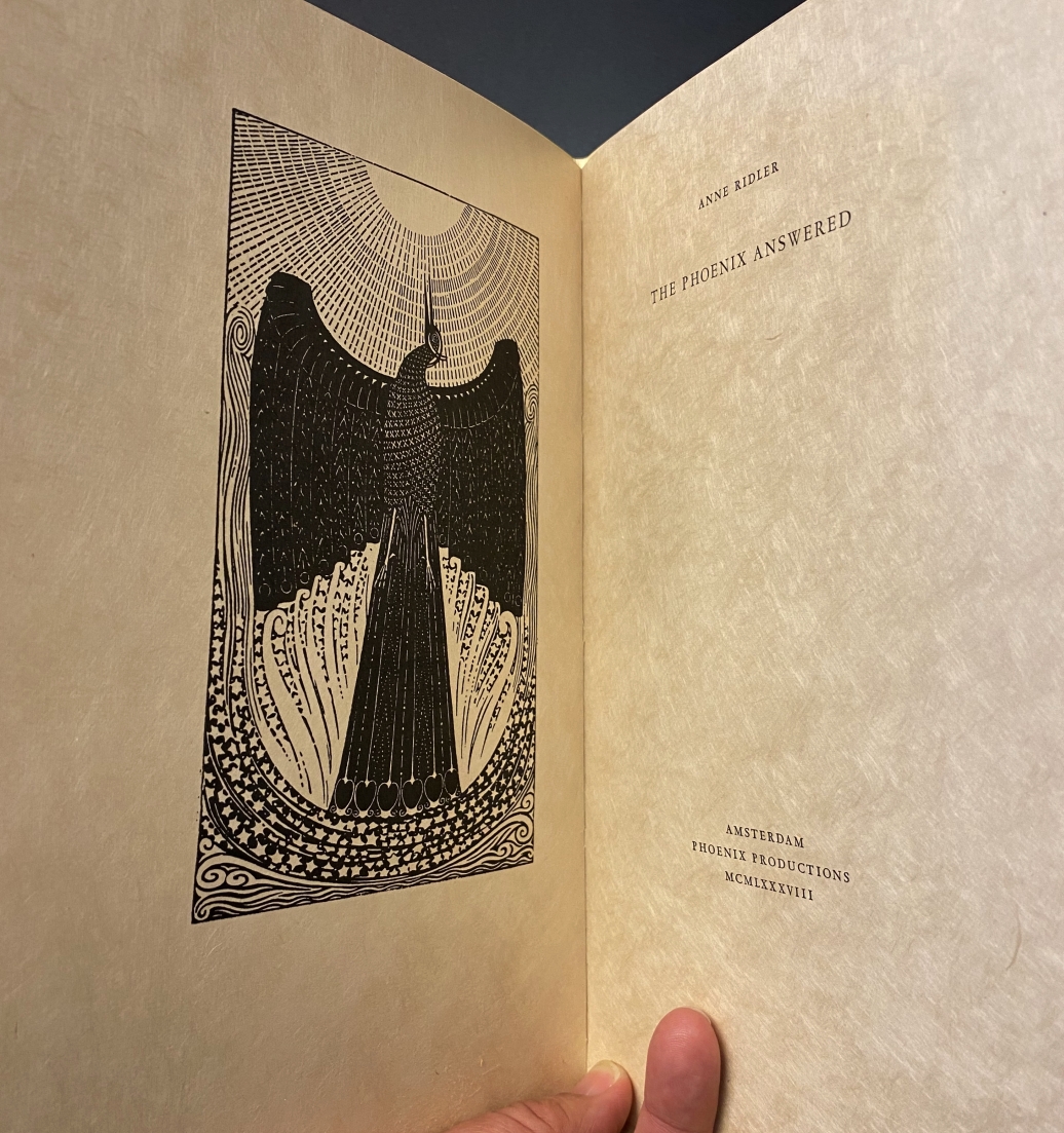 25. RIDLER, Anne The Phoenix answered. Amsterdam, Phoenix Productions, 1988. Ingenaaid. (16) p. Engelstalig gedicht. Voorin een afbeelding van een uit zijn as verrijzende phoenix in art-nouveau. Met de hand gezet en gedrukt door Hein Elferink in een oplage van 100 genummerde exemplaren. Inliggend wenskaartje.