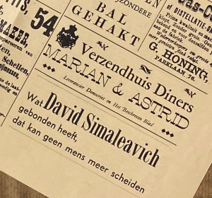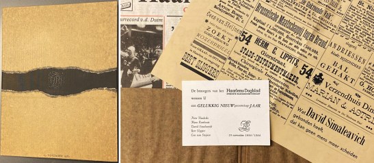 * David Simaleavich was trots op de inventieve band die hij voor deze gelegenheid vervaardigde: met een scheurzone van zwart linnen tussen het kraftpapier en bedrukt met het sierlijke monogram van dit zeer selecte genootschap van papier- en drukliefhebbers, alsmede de datum, beide in zwart uitgevoerd op de verguldpers. Op de reproductie van de krant uit 1886 zijn zes moderne advertenties binnengeslopen (ook een van David), en een ingezonden brief (van Ab van der Steur).