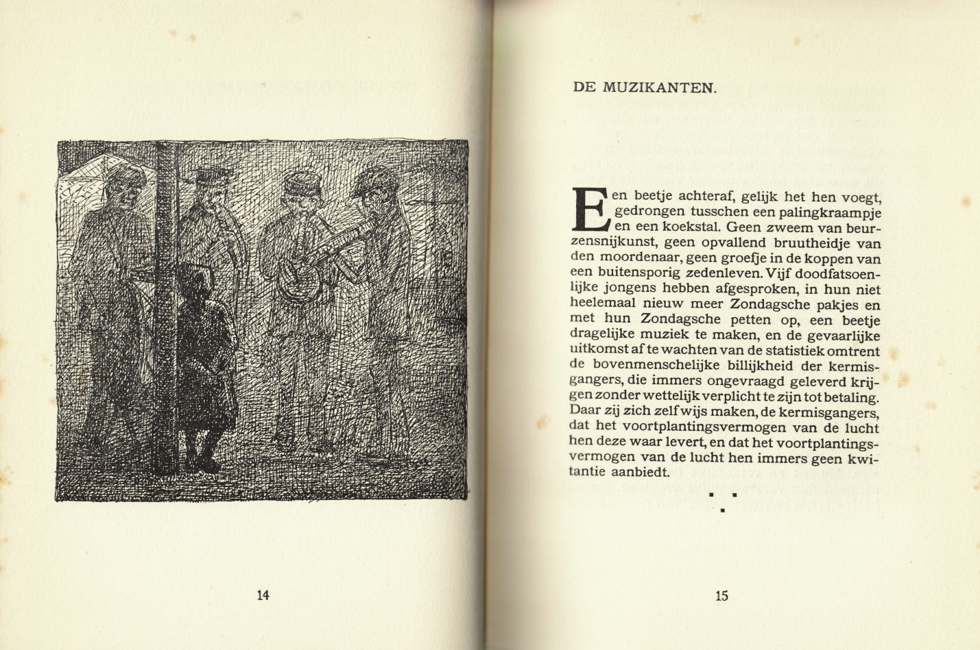 * Met zeldzaam in rood en zwart gestencild prospectus. Eigen beheer-uitgave, door schilder en schrijver gesigneerd en gedateerd ‘Mei 1924’. Curieuze, filmische verzameling schetsen, geïllustreerd met intrigerende, qua stijl nogal uiteenlopende tekeningen van de schilder Chris Beekman, waaronder een die regelrecht uit De Stijl zou kunnen komen. Modernisme op zijn speelst!