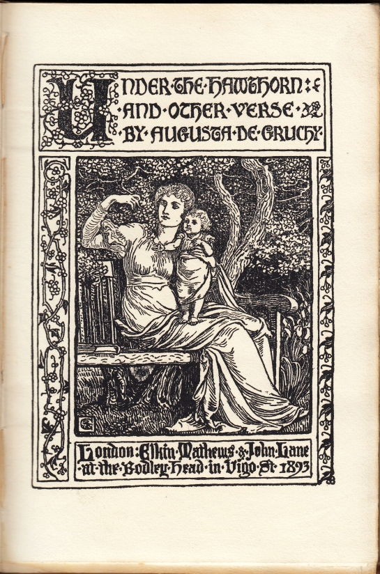 16. (CRANE, Walter). GRUCHY, Augusta De Under the Hawthorn and other Verses. London, Elkin Mathews & John Lane in the Bodley Head, 1893. Linnen. (6), 86 p. Met frontispice van Walter Crane. Gedrukt op geschept papier. 1e druk. Band wat verbleekt en niet helemaal fris. Exlibris van de Zuidafrikaanse plantkundige Harry Bolus (1834-1911), een door hemzelf ontworpen uitzicht op de Tafelberg.