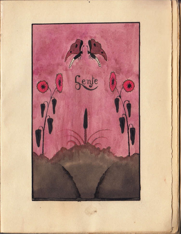 2. BARTELSE, Marinus Van liefde en leven. (85 sonnetten in handschrift met versierde tussentitels). Zelfgemaakt fluwelen bandje. 102 p. Handschrift (rood en zwart), net en regelmatig: foutloos gespeld, zonder doorhalingen, met 4 decoratieve tekeningen in kleurinkt. Bundel van 80 sonnetten verdeeld volgens de seizoenen met getekende tussentitels in kleur, gevolgd door vijf thematische sonnetten, één met erbij geschreven ‘Herinnering Eindex. HBS 1915 Goes’. Aan het eind met veel krullen gesigneerd door de jeugdige dichter, Marinus M. Bartelse, ‘Goes, 30 Sept. 1916’. Voorkant met flinke slijtplek in het fluweel, alsof er een schildje of plakker is verwijderd. Gebruikssporen.