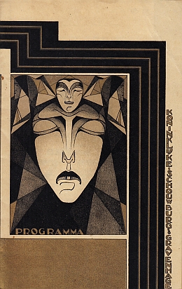 * Fantastisch expressionistisch serieontwerp van Pieter A.H. Hofman, dat gedurende enkele jaren met kleine variaties door het Vereenigd Tooneel gebruikt werd. Ook het Wijdeveld-achtige binnenwerk is van Hofman, met zijn monogram getekend. Mooie advertenties voor piano’s en radio’s.