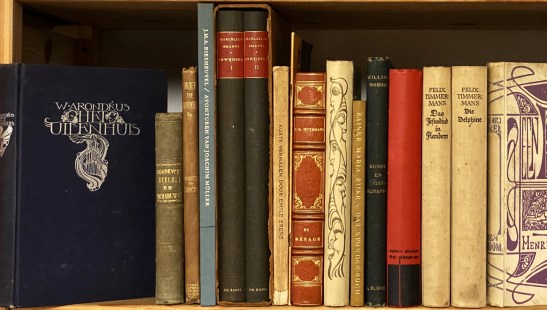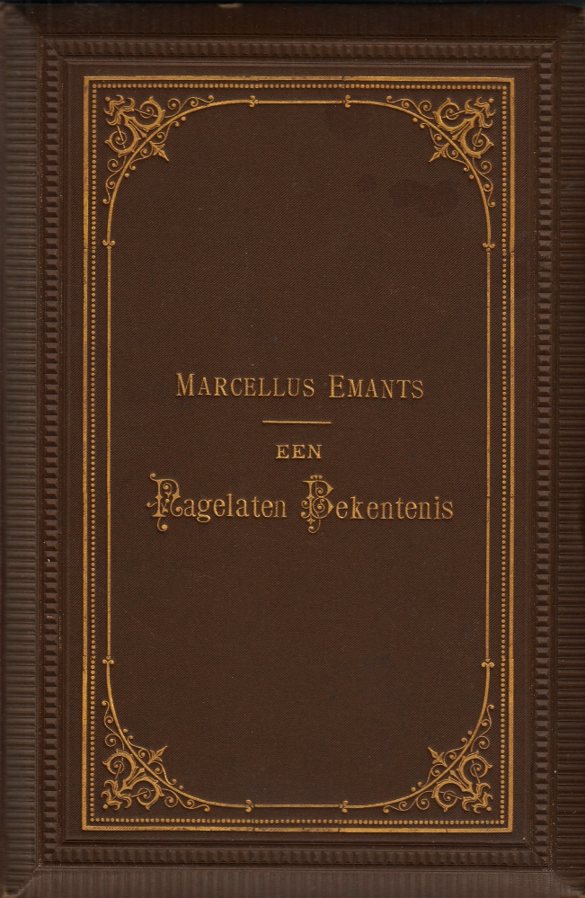 18. EMANTS, Marcellus Een nagelaten bekentenis. Amsterdam, Van Holkema & Warendorf, [1894]. Linnen. (4), 292 p. 1e druk. Heel mooi exemplaar van de originele band, met afgeschuinde randen, fraai verguld en geblindstempeld – alleen is de achterste kneep los. Voorin de handtekening van een vroegere eigenaar, ‘Rosenstein’.