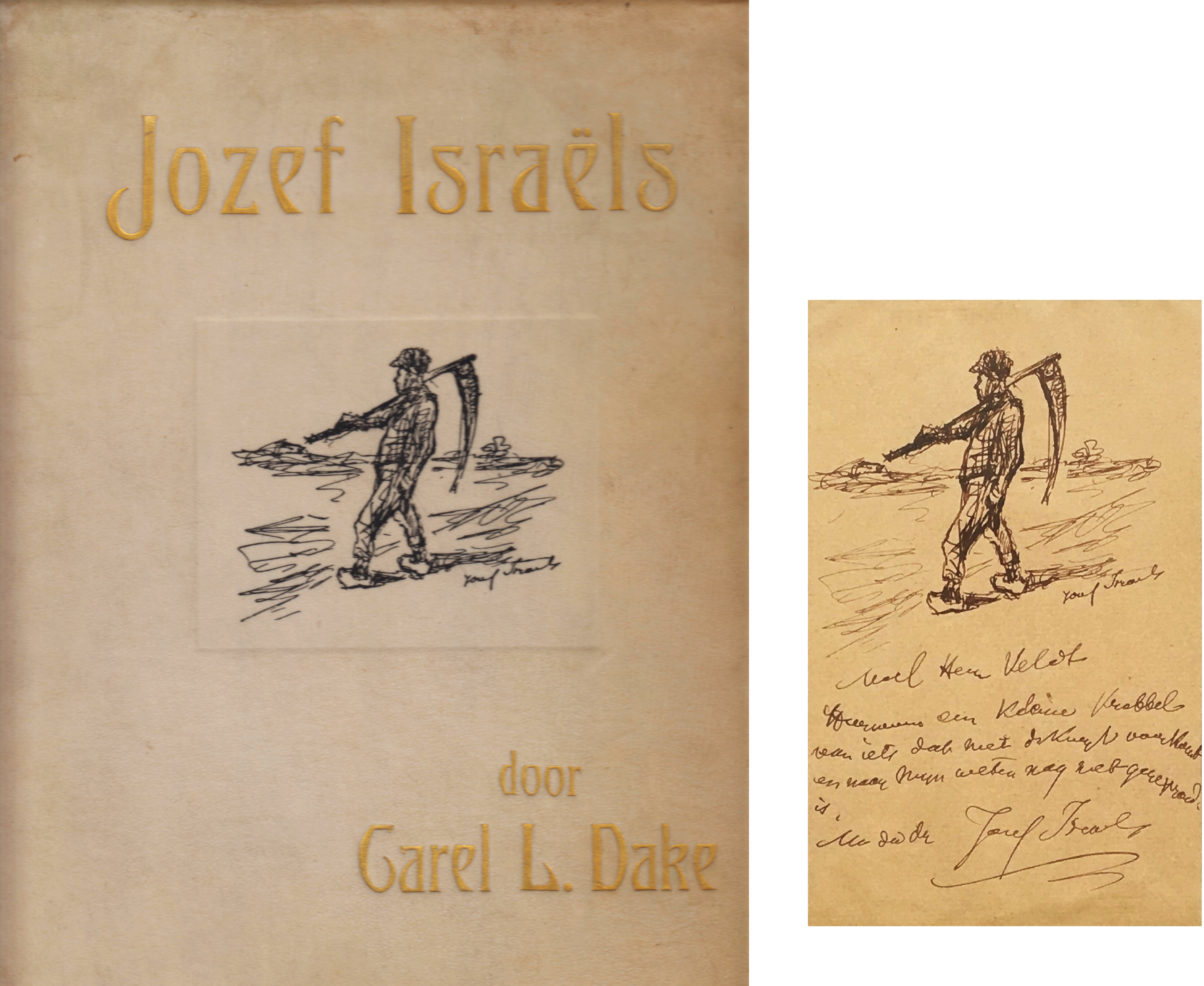 * Bijgevoegd: Carel L. DAKE, Jozef Israëls. Amsterdam, C.L.G. Veldt, [1910]. 32 x 25 cm. Verguld heelperkament. 82 p. Gedrukt in donkerrood en zwart. Met een heliogravure, in goudbruine inkt afgedrukt, van de prent ‘Vissersvrouw’, beschermd met vloeipapier. Twee fotografische reproducties van schilderijen in kleuren en vele in zwartwit afgedrukt op kunstdrukpapier. Met kleine schetsjes in boekdruk in hoekjes van pagina’s. Getekende initialen in donkerrood en zwart. 1e druk. Band met wat verkleuring, papier met enkele roestvlekjes.