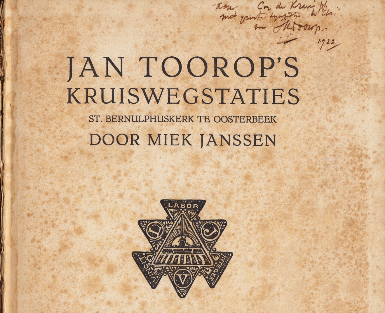 7. (TOOROP, Jan). JANSSEN, Miek Jan Toorop’s Kruiswegstaties. St. Bernulphuskerk te Oosterbeek. (Gesigneerd met handgeschreven opdracht van Toorop). Amsterdam, L.J. Veen, [1922]. Karton. 48 p. Geïllustreerd. 1e druk. Rug ontbreekt. Kneep gebroken. Nogal roestvlekkig.