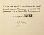 * Dit is nummer 13 van de 30 genummerde luxe-exemplaren, gebonden in perkament en gesigneerd door Toorop. Studie door de eigenzinnige criticus Albert C.A. Plasschaert (1874-1941). Met 44 zwartwit-afbeeldingen van Toorops werk. Als frontispice een portret van Toorop door Leo Gestel.