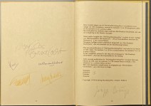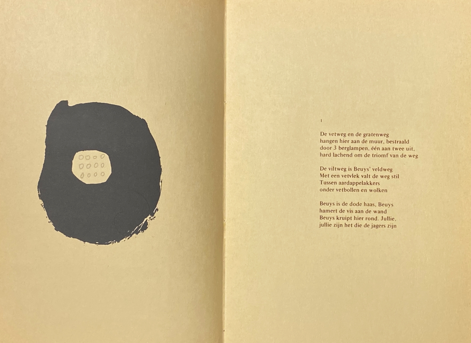 * DIT IS NUMMER I van de 50 Romeins genummerde luxe-exemplaren die werden gebonden in linnen en gevat in een foedraal. Dit bijzondere exemplaar werd onder en tegenover het colofon niet alleen gesigneerd door Beuys en Ter Balkt, maar ook door Maarten Beks, Klaus van der Locht, Willem van Lieshout en Koos van Tol. Beks en Van der Locht vertaalden de gedichten van Ter Balkt in het Duits, galeriehouder Van Lieshout bemiddelde bij de totstandkoming van de uitgave en Koos van Tol drukte het geheel. Met opdrachtje van Van der Locht: ‘Voor Cees [van Maurik]’. Cees van Maurik (1934-2017) werkte aanvankelijk in het papier en in de reclame, later werd hij adjunct-directeur van uitgeverij Veen.