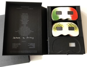 Spectaculaire boekbanden van kunstenaars: De Phoenix spreekt in heelperkament met een grote zon in goud over de hele band, een van de drie exemplaren van Mijn minnaars in slap perkament en Peper en zout in heelleer, ingelegd met messing.