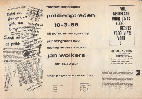 35. (WOLKERS, Jan) Fototentoonstelling politieoptreden 10-3-66 bij polak en van gennep prinsengracht 820 opening 19 maart 1966 door jan wolkers om 14.30 uur. (Strooifolder). Oblong. Eén blad A4. Voorzijde een foto van lachende politiemannen die een jongen aan de haren meesleuren met de datum ’10-3-66′ gedrukt in vette letters. Keerzijde een collage van krantenknipsels geflankeerd door de data van de fototentoonstelling, en reclame voor drie kritische weekbladen. Wat verkleurd en gevlekt en met een commentaar in onbekend handschrift.