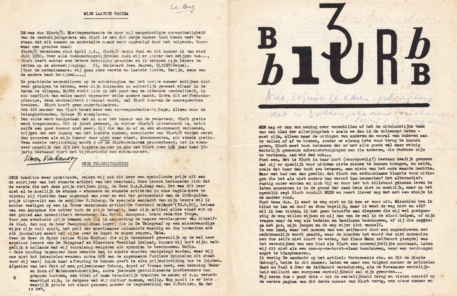 3. (BLURB). VINKENOOG (red.), Simon Blurb 3. (Clichy, eigen beheer, 1950). Gestencild. 8 p. Wat vlekjes op de achterzijde.