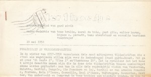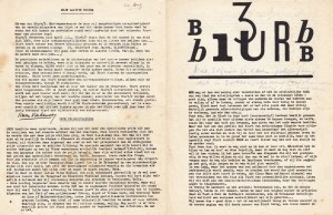 * Een tweede exemplaar, maar nu is er bijgevoegd: prospectus voor poëziereeks De Windroos (‘ingezonden mededeling’), speciaal voor de abonnees van Blurb gedrukt op de vloeistofduplicator.