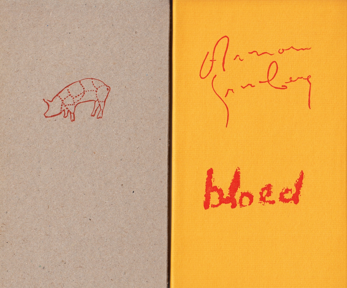 12. GRUNBERG, Arnon Bloed. Met houtsneden van Nicholas Meersschaert. Kalmthout, De Carbolineum Pers, 2017. Karton in foedraal. 68 p. Met de hand gezet uit de Goudy Old Style en gedrukt op Hahnemuhle in rood en zwart in een oplage van 60 genummerde en door de auteur en kunstenaar gesigneerde exemplaren. 1e druk.