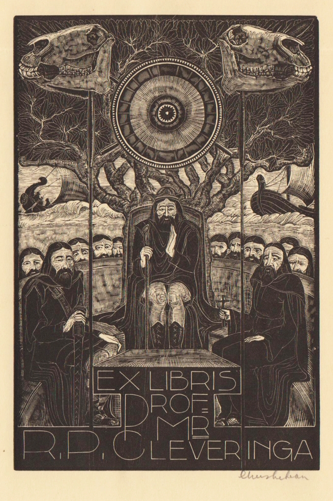 8. CLEVERINGA, R.P./ Chris LEBEAU Exlibris van prof.mr. R.P. Cleveringa. In: Goethes Mutter, van Karl Heinemann (1909). Op de houtgravure van Lebeau, die vermoedelijk uit de jaren 30 dateert, ziet men de Wijzen, verzameld onder de Upstalsboom, die de stadsrechten van Cleveringa’s geboortestad Appingedam bevestigen. Bladformaat 14,5 x 10,0 mm, prentformaat 12,2 x 8,2 cm. Rechtsonder in potlood gesigneerd door Lebeau.