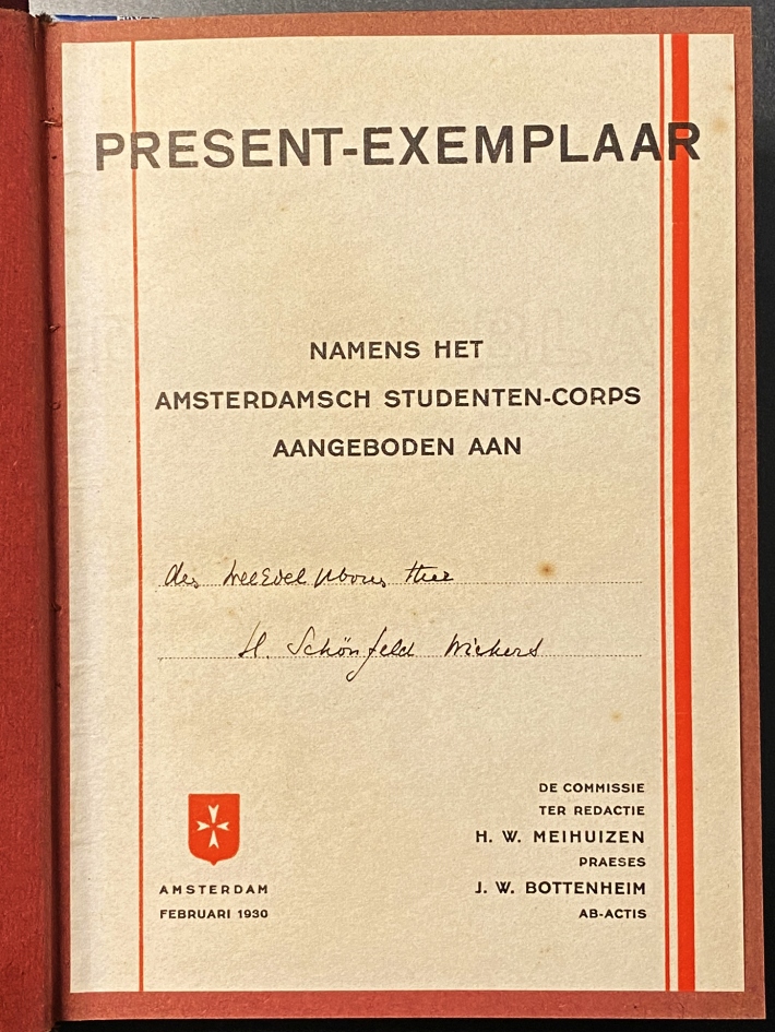 * Herman Pieter Schönfeld Wichers (1902-1990), alias Belcampo, studeerde rechten aan de Universiteit van Amsterdam (tegelijk met o.a. H. de la Fontaine Verwey en Jacob Hiegentlich). Dit zijn drie studentenalmanakken uit de bibliotheek van Belcampo, alle drie met voorin ingeplakt gedrukt blad ‘Present-exemplaar/ namens het/ Amsterdamsch Studenten-Corps/ aangeboden aan/ [handgeschreven:] den Weledelgeboren Heer/ H. Schönfeld Wichers’ wegens geleverde literaire bijdragen. (In alle exemplaren is de aanwezigheid van Belcampo als rechtenstudent gemarkeerd met moderne bladwijzers.)