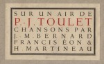 37. TOULET, Paul-Jean; ÉON, Francis; BERNARD, Jean-Marc; MARTINEAU, Henri Sur un air de Paul-Jean Toulet. Chansons par Jean-Marc Bernard, Francis Éon et Henri Martineau. Brussel, Éditions un coup de dés…, 1927. 26 x 22 cm. Origineel omslag met flappen. 12 p. Gezet uit de Lutetia en gedrukt in rood en zwart in 170 genummerde exemplaren op de persen van Joh. Enschedé & Zonen. 1e druk. Omslag nogal vlekkig, vooral aan de achterkant. Binnenwerk in goede staat.
