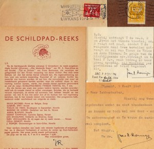 33. (ROMIJN, Jac. P.). (SCHILDPADREEKS) Drie persoonlijke briefjes over de Schildpadreeks plus drie prospectussen. 1. Getypte, in pen gesigneerde brief op dun papier, gedateerd ‘Utrecht, 2 Januari 1943’, aan ‘Geachte heer Lekkerkerker’. Met getypte en gezegelde envelop met poststempel van 4 januari.